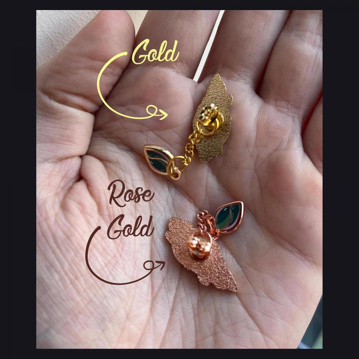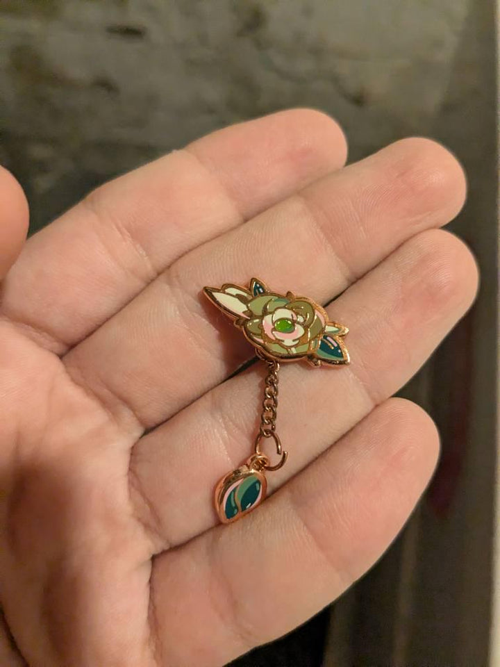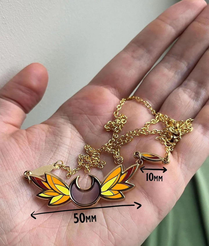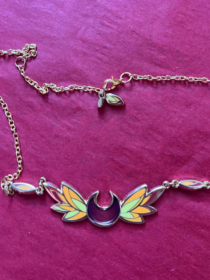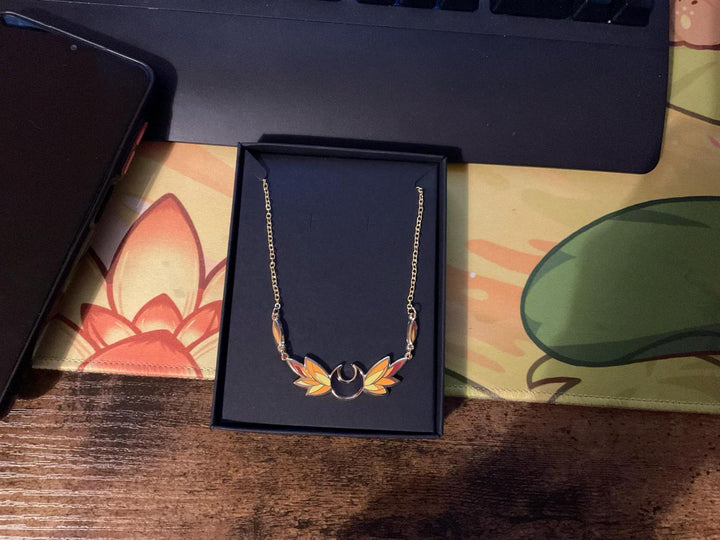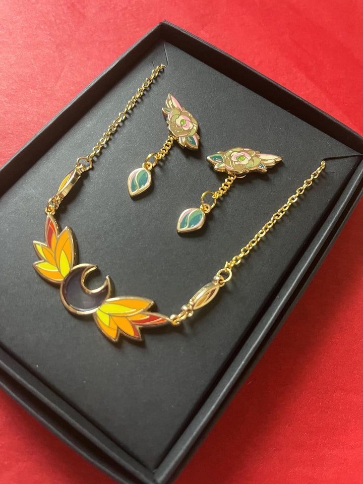This jewelry set is inspired by Hades. The necklace, Moon of Erebus, is inspired by Melinoë's wreaths and the moon. It features a semi-transparent moon of Stained Glass enamel with a blue-purple gradient, as well as two chain length customizations. The back of the necklace features two little flowers for a little extra cuteness and to help keep your necklace in place.